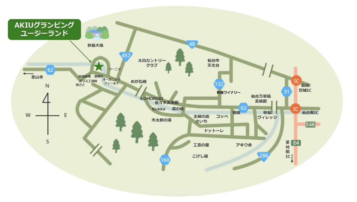 - 仙台駅より西部ライナーで里センター下車→乗合タクシー「ぐるりんあきう」(平日のみ)